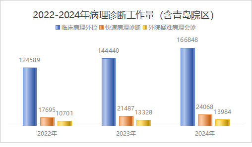 病理科每年承担山东大学齐鲁医院的年外检病理量超过16万例(含青岛院区);外院疑难会诊1.7万例,稳居全省前列。科室建立了 PCR 、 FISH 、一代测序及二代测序等技术平台,推动了精准病理诊断、临床个体化治疗及遗传咨询工作。为促进病理同仁的相互交流、提升区域病理诊疗水平,2018年牵头成立了"山东大学病理中心",通过远程会诊、资源共享,搭建多样化病理交流平台。每年主办国家级、省级学术会议,其中每年一次的山东省读片会、每月一次的济南市读片会已持续50余年,成为全国坚持时间最久的品牌性系列病理读片会。